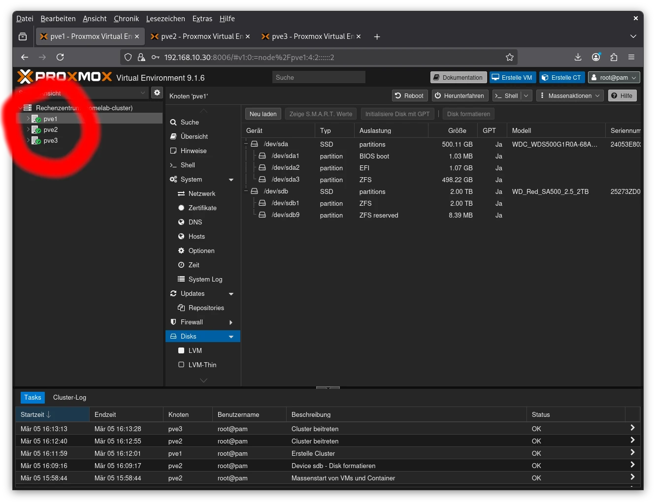 All three nodes are now part of a single Proxmox cluster. Each keeps its local ZFS pool β no shared storage is required. Offline migration of VMs allows workload balancing and better hardware utilization, while the central GUI provides convenience for management. π»β‘